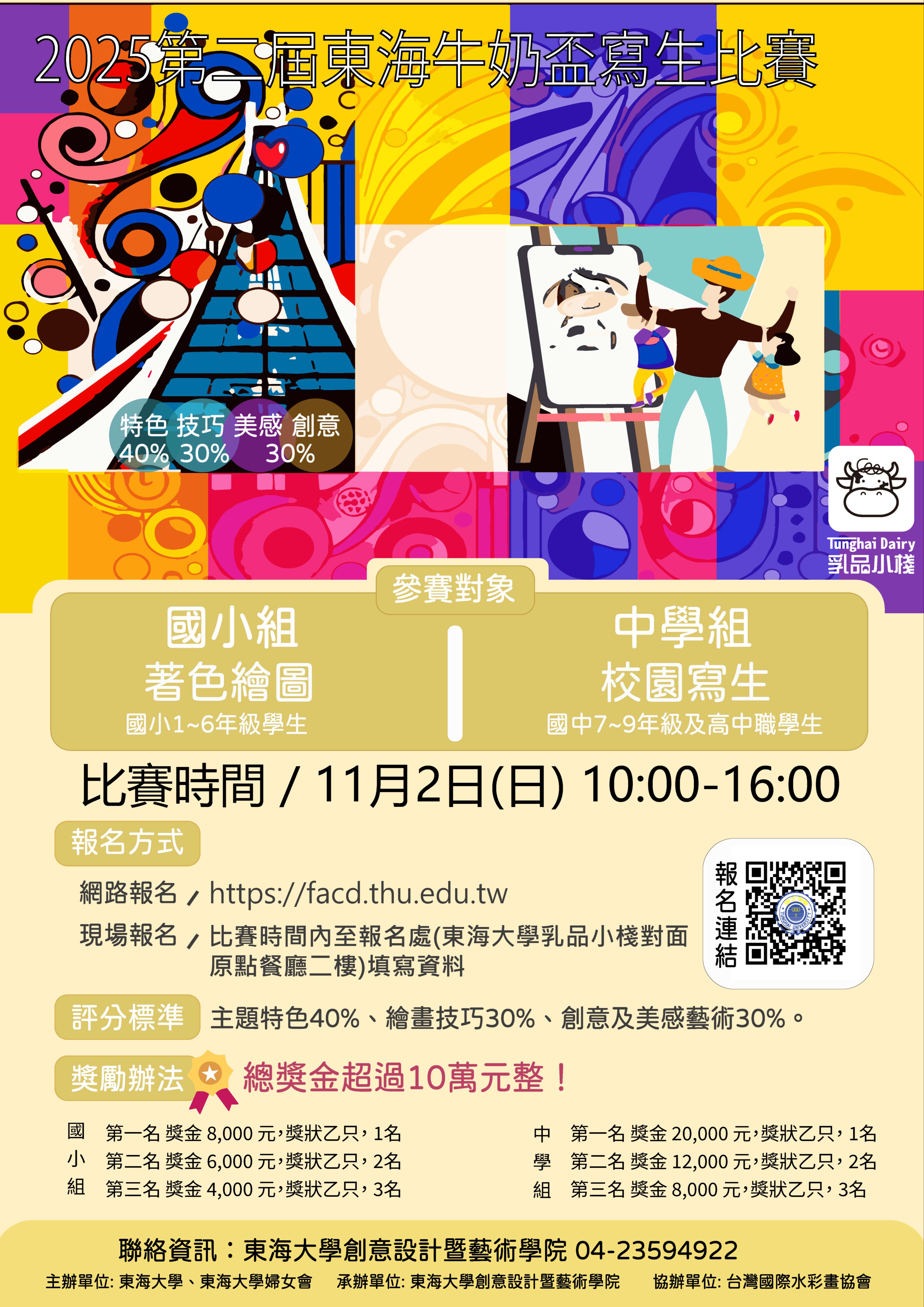 三、比賽資訊及線上報名連結,請逕上該校創意設計暨藝術學院網站公告:https://facd.thu.edu.tw 。