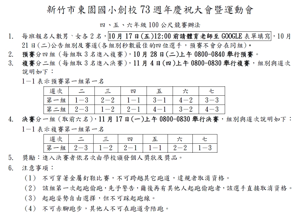 個人比賽道次表,預計10/22(三)紙本發至各班。