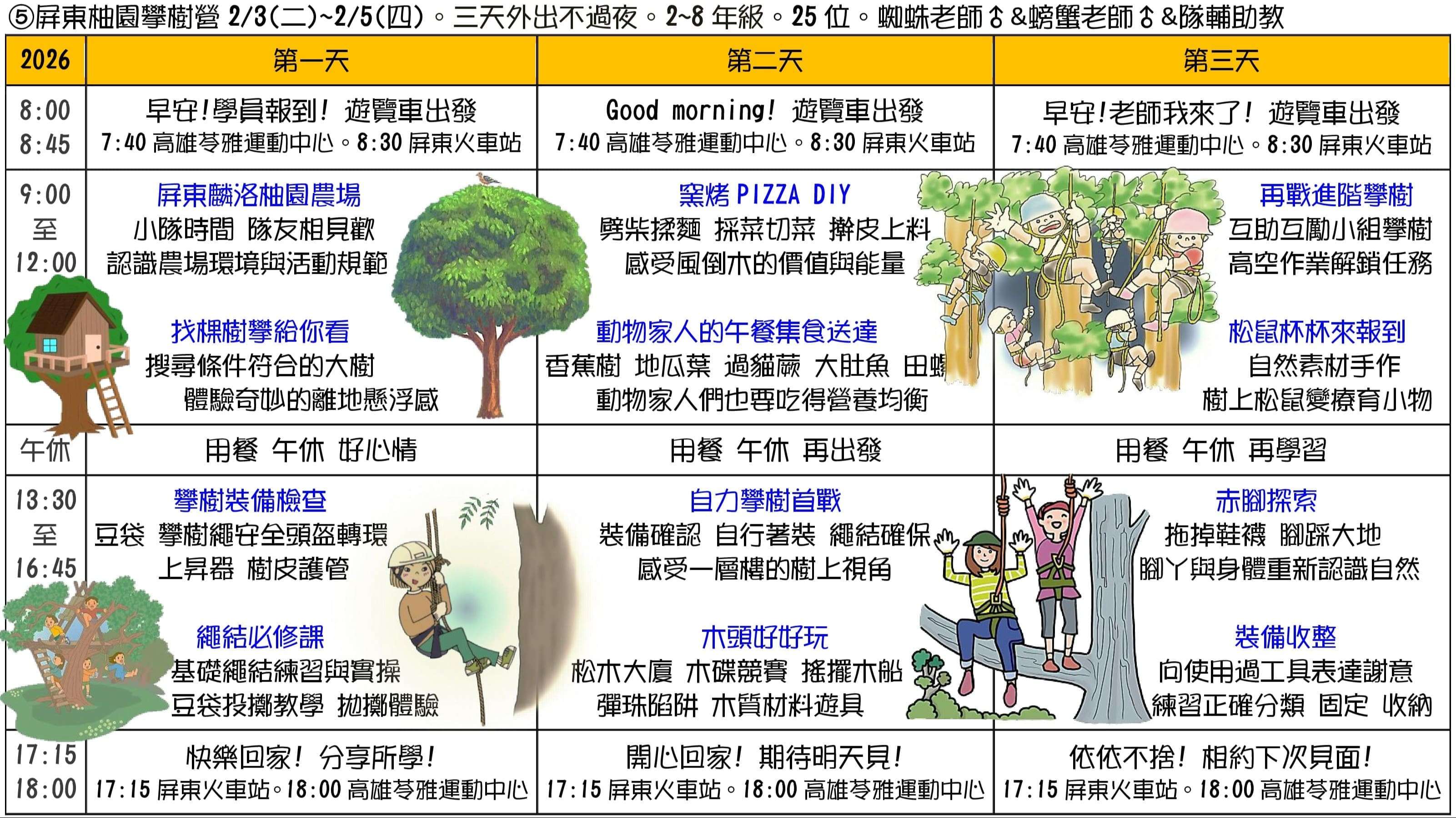 | 二、 | 課程主題:①蘭陽山野求生營(5天4夜)、②小琉球海龜營(5天4夜)、③宜蘭生態農場營(3天2夜)、④TPE博物館生態營(3天外出不過夜)、⑤屏東柚園攀樹營(3天外出不過夜)、⑥節肢小怪獸營(3天大學不過夜)、⑦池上單車生態營(4天3夜)。 |