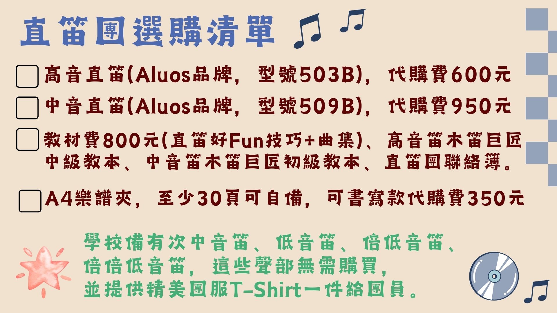 (check mark)中音笛進階班(招收四、五年級學生,具備正確的持笛姿勢、運指、運舌技巧)