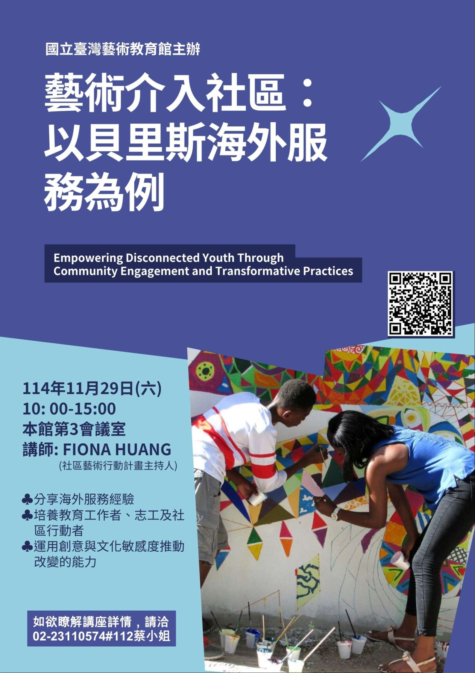 (七)    參與對象:教育人員、藝術教育工作者、海內外志工與國際服務團成員、青年社區工作者、社會設計從業者及對藝術與社區實踐有興趣之一般民眾。