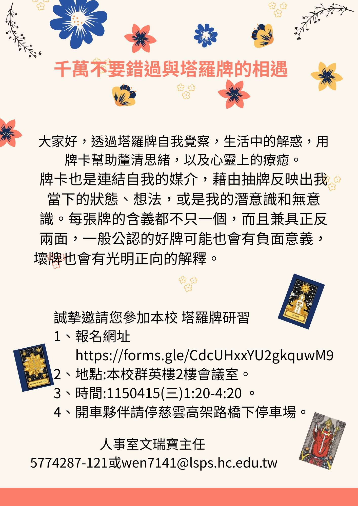 旨:本校謹訂115(本)年4月15日(星期三)下午辦理「115年 度推動員工協助方案(EAP)《在牌中遇見自己》──觀塔 羅的內在覺察療癒工作坊」,請轉知所屬踴躍報名參加, 請查照。